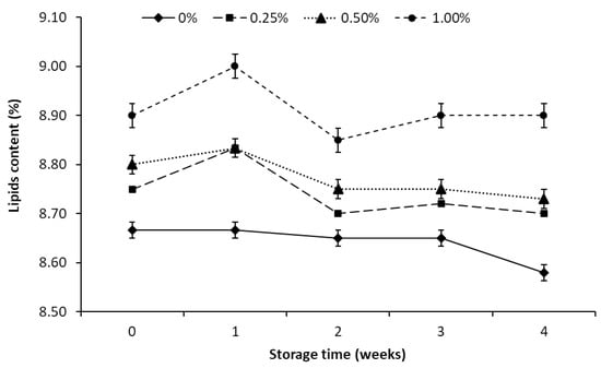 Lipids content in acid curd cheese with different addition (0–1%) of astaxanthin lipid preparation (ALP) during 4 weeks of refrigerated storage (5 ± 1 °C).