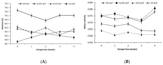 All the evaluated cheeses were characterised by stable and the normative moisture content ranging from 68.8% to 70.4% (Figure 2A and Table 1). The control sample had 70.4% moisture. The increase in the lipid content by the addition of ALP was accompanied by a decrease in the moisture of the cheeses to 68.8–69.5%. Changes in moisture content of ACCs were statistically insignificant. Such small changes in moisture are probably due to evaporation of water from the product to the package walls observed in refrigerated stored foods. The lack of significant changes in the chemical composition of acid curd cheeses stored under refrigeration was reported, among others, by Śmietana et al. [40].