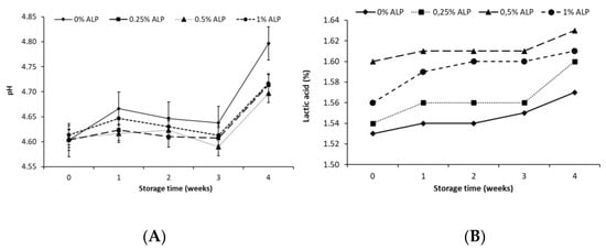 Value of pH (A) and titratable acidity (B) of acid curd cheese with different addition (0–1%) of astaxanthin lipid preparation (ALP) during 4 weeks of refrigerated storage (5 ± 1 °C).