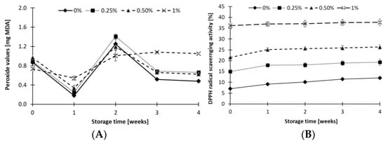 The antioxidant activity of the control sample was 7% (Figure 4B). The samples with ALP had higher scavenging activities than the control sample (p < 0.05). Radical scavenging activities (RSA) increased significantly (p < 0.05) in all samples with increased storage time. In the control sample, RSA increased by 5% after 4 weeks of storage and the respective increase in 0.25%, 0.50% and 1% ALP cheese was 4.3%, 4.8% and 1.5%, respectively. An increase in DPPH during the ACC storage was also shown by Kariyawasam et al. [46]. Cheese contains a large amount of casein, which is proteolyzed by enzymes present in milk and bacterial enzymes, causing the production of peptides, some of which show a potential antioxidant activity [47]. In the present study, this potential was significantly increased in the presence of astaxanthin. UV–VIS analysis of chloroform extracts showed that only 1% ALP addition significantly increased both primary and secondary lipid oxidation products in the ACC (data not shown). Moreover, with increasing ALP addition, there were more primary oxidation products than secondary oxidation products.