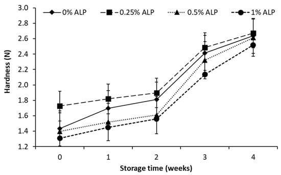 Hardness of acid curd cheese with different addition (0–1%) of astaxanthin lipid preparation (ALP) during 4 weeks of refrigerated storage (5 ± 1 °C).
