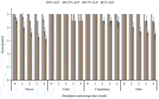 Sensory evaluation 4 descriptors of acid curd cheese with different addition (0–1%) of astaxanthin lipid preparation (ALP) during 4 weeks of refrigerated storage (5 ± 1 °C).