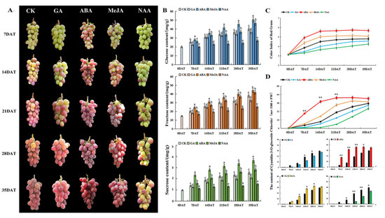 The sugars in grapes mainly include glucose, fructose, and sucrose, in which the contents of glucose are the highest, and the proportion of sucrose is the smallest (Figure 1B). With the growth and development of fruit, the contents of soluble solids and three kinds of soluble sugar gradually increased, and the contents reached the highest at the ripening period. After treatments of ABA and MeJA on grape berries, the contents of soluble solids and soluble sugars (glucose, fructose, and sucrose) increased significantly. In contrast, after GA and NAA treatment on grape berries, the contents of soluble solids and soluble sugars decreased; in particular, the NAA treatment inhibited berry veraison and ripening.