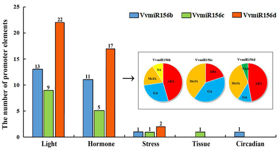 As shown in Figure 2 and Table S7, promoter cis-elements of VvMIR156b/c/d can be classified as light-related, hormone-related, stress-related, tissue-specific, and circadian-related elements based on their potential functions. Among these five groups, the number of light-related elements was the largest, which might be due to the important role of light in photosynthesis for plant growth and development, followed by the hormone-related elements, whereas the number of cis-elements, responsive tissue-specific and circadian-related, were detected to be less. These motifs could indicate the corresponding miRNAs and potential functions of genes.