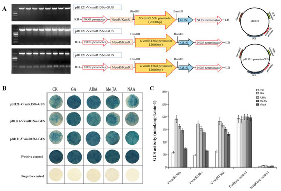 The promoter vectors (pBI121-VvmiR156b/c/d-35SCaMV) were conducted as shown in Figure 3A. After GUS histochemical staining, it was found that full-length promoter vectors of VvmiR156b/c/d (pBI121-VvmiR156b/c/d-35SCaMV) were stained blue, and the positive control (pBI121 carrier with 35SCaMV promoter) also appeared blue, while the negative control (pBI121 carrier without 35SCaMV promoter) did not show a blue color, indicating that the promoter of VvmiR156b/c/d (pBI121-VvmiR156b/c/d-35SCaMV) had GUS activity. After GA, ABA, MeJA, and NAA treatments, GUS staining of the VvmiR156b/c/d promoter vectors (pBI121-VvmiR156b/c/d-35SCaMV) deepened and GUS activities were enhanced to a certain extent, while the positive control (pBI121 carrier with 35SCaMV promoter) remained almost unchanged (Figure 3B,C). Our results show that the VvmiR156b/c/d promoter regions contained multi-hormone cis-elements and responded to multi-hormone signals.