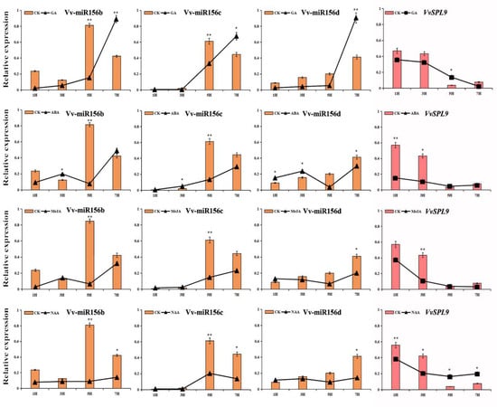 To identify the transient induction effect of exogenous hormones on VvmiR156b/c/d and VvSPL9, the treated grape leaves with GA, ABA, MeJA, and NAA were used to detect the expression of VvmiR156b/c/d and VvSPL9. As Figure 4 shows, in the control samples, VvmiR156b/c/d exhibited lower expression levels at 1HAT and 3HAT, while showed higher expression levels at 5HAT and 7HAT; conversely, their targets showed the opposite expression modes, indicating the potential negative regulatory roles of VvmiR156b/c/d on VvSPL9. Furthermore, we revealed that among the four hormone treatments, GA significantly upregulated the expressions of VvmiR156b/c/d at 7HAT and decreased VvSPL9 at the corresponding stage, thereby enhancing their negative correlation at the expression levels, which suggests that GA promoted the negative regulatory roles of VvmiR156b/c/d on VvSPL9. Although the other three hormone treatments nearly downregulated the expression levels of VvmiR156b/c/d and VvSPL9 at all times, the expression levels of VvmiR156b/c/d and VvSPL9 under the ABA, MeJA, and Auxin hormones treatments could still maintain a negative correlation, implying that these hormones mediate the negative regulatory roles of VvmiR156b/c/d on VvSPL9. Meanwhile, the results suggest that these modules had a stronger response to GA than the remaining three hormones ABA, MeJA, and Auxin, similar to the GUS stain results above (Figure 3).
