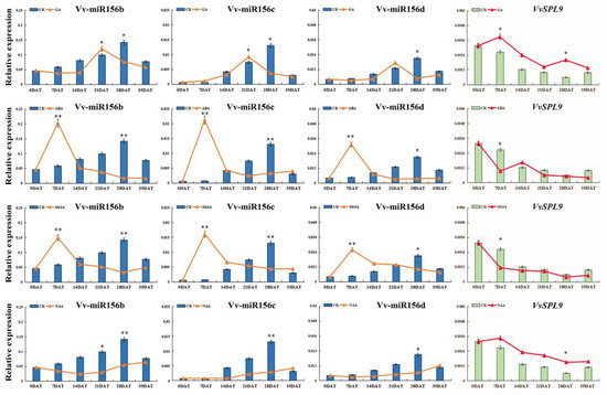 Differential expression of VvmiR156b/c/d and their VvSPL target genes in response to different hormone treatments at different time points [seven days after treatment (7DAT), 14DAT, 21DAT, 28DAT, 35DAT] of berry development. Asterisks indicated statistically significant differences at (* p < 0.05; ** p < 0.01) as determined.