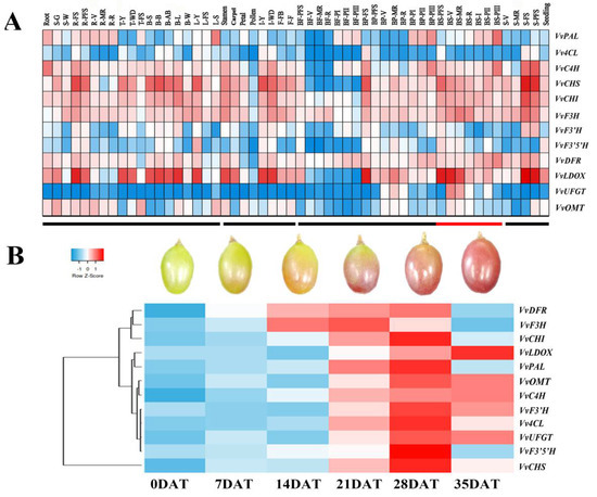 The biosynthesis of anthocyanins is controlled by structural and regulatory genes. In order to investigate the temporal and spatial expression patterns of anthocyanin structural genes, we analyzed the expression patterns of 12 anthocyanin structural genes based on the transcriptional mapping data of 54 tissues, organs, and development stages [32]. In the expression profile, the red color indicates strong gene expression, while blue indicates weak gene expression (Figure 6A). VvC4H, VvCHS, VvCHI, VvF3H, VvDFR, VvLDOX, and VvOMT were highly expressed in grape roots, stems, buds, and rachis; VvCHS, VvCHI, VvF3H, and VvLDOX were also strongly expressed in flower and seed; moreover, VvPAL, VvF3H, VvDFR, and VvLDOX were also strongly expressed in the berry, while VvUFGT was only specifically highly expressed in the berry skin and pericarp. In addition, we found that in flesh, most of the anthocyanin synthesis-related genes were highly expressed in the berry flesh ripening period. In pericarp, most of the anthocyanin synthesis-related genes were highly expressed in the berry pericarp mid-ripening period. In the peel, most of the anthocyanin synthesis-related genes were highly expressed in the berry skin veraison period.