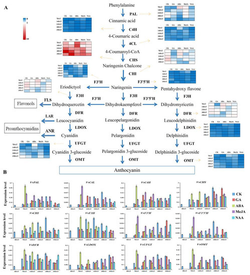 Grape berry ripening is an extremely complex physiological and biochemical process, accompanied by the formation of fruit color, flavor, and aroma. Among them, the color of grape berry is an important indicator of fruit quality. As grapes color, sugar and aroma accumulate in the berries. Therefore, the berry color and its related qualities above-mentioned directly affect its price and market competitiveness. Anthocyanin is the main pigment in grapes including cyanidin, delphinidin, peonidin, petunidin, and malvidin. Fruit color development is a very complex metabolic process, which is not only affected by genotype, climatic conditions, and cultivation techniques, but also by plant hormones. In the process of fruit coloring, plant hormones are key regulators and play important roles. A variety of hormones interact to co-regulate the formation of colors such as abscisic acid (ABA), gibberellin (GA), ethylene (ETH), auxin (AUX), and jasmonic acid (JA). The application of exogenous hormones can cause changes in endogenous hormones modulating the color formation. For example, ABA, ETH, and JA treatments promote fruit coloring and ripening; conversely, AUX applications inhibit the corresponding processes [1,2,3,4]. Therefore, the effect and regulation mechanism of plant hormones on plant color has always been a hotspot of research.