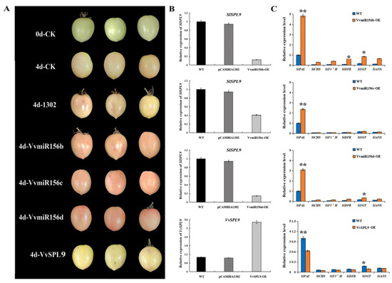 Transient overexpression of VvmiR156b/c/d and VvSPL9 in tomato. (A) VvmiR156b/c/d-OE andVvSPL9-OE fruits four days after infiltration. (B) The expression of SPL9 in tomato. (C) VvmiR156b/c/d-OE andVvSPL9-OE effects on the expression of anthocyanin-related genes in tomato. ANOVA test was used to identify significant differences, asterisks indicate statistically significant differences at (* p < 0.05; ** p < 0.01) as determined by the Student’s t-test.