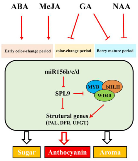 Similar to protein-coding genes, the promoter region of plant miRNA genes contains a variety of important cis-acting elements, which are key to the regulation of gene expression. Through promoter action element analysis, we found that the promoter sequence of vmiR156b/c/d contained a large number of hormone-related elements including ABA (ABRE), GA (GARE-motif, P-box, TATC-box), MeJA (CGTCA-motif, TGACG-motif), and auxin (TGA-element) responsive cis-elements. Of these hormone cis-acting elements, ABA and MeJA had the most cis-acting elements, followed by GA, while NAA had the least cis-acting elements. Based on this, ABA, GA, MeJA, and NAA were used to treat grape leaves and fruits, respectively, to verify the short-term and long-term effects of VvmiR156b/c/d and VvSPL9 response hormones. Interestingly, GA treatment downregulated the expression levels of VvmiR156b/c/d and anthocyanin structural genes in the early color-change period, but significantly upregulated the expression in the middle color-change and ripening stages. In addition, GA upregulated the expression levels of anthocyanin structural genes in the middle color-change stage and ripening stage, so GA mainly promoted grape berry coloring in the middle- and late-ripening stages. After ABA and MeJA treatment, grape berries can quickly color. ABA and MeJA significantly upregulated the expression levels of VvmiR156b/c/d and anthocyanin structural genes in the early stage of color conversion (7DAT and 14DAT), and ABA and MeJA are mainly involved in the formation of color in the early color-change period. NAA treatment downregulated the expression of VvmiR156b/c/d and anthocyanin structural genes; NAA delayed the peak expression of genes to 35DAT and is mainly involved in the formation of color in the mature stage. Thus, we conclude that VvmiR156b/c/d-VvSPL9 can respond to different hormone signals to participate in the formation of anthocyanin of different periods (Figure 9), but the mechanism of the hormone signaling pathway remains unclear. At present, a variety of miRNA has been proved to be involved in the response and synthesis of plant hormones. miR167 affects the development of pistils, stamens, and petals of Arabidopsis thaliana by regulating the expression of ARF6 and ARF8 [51], and miRl60 affects the formation of root cap cells by regulating the expression of ARF10 and ARF16 [52]. DELLA, the key molecule of gibberellin signal transmission, has a direct protein interaction with the target gene SPL of miR156. Gibberellin is regulated by the transcription factor of the target gene SPL of miR156 [53]. More interestingly, miR159 appears in many plant hormones signaling pathways. It can be up-regulated by the regulation of GA and ABA [54,55], and it will be down-regulated by the regulation of ethylene [56]. There are various kinds of miRNAs, and with the discovery of new miRNAs in different species, there is still a long way to go to clarify the relationship between miRNAs and plant hormones.