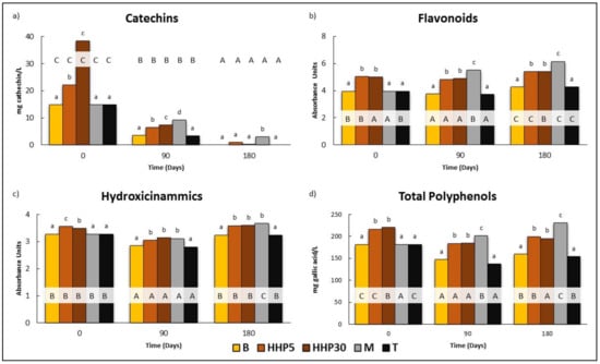 Changes in catechin, flavonoids hydroxicinnamics, and total polyphenols did not follow a clear pattern during storage. They slightly decreased at day 90 while they increased at day 180. HHP5 and HHP30 followed similar changes as M with lower values than B and T.