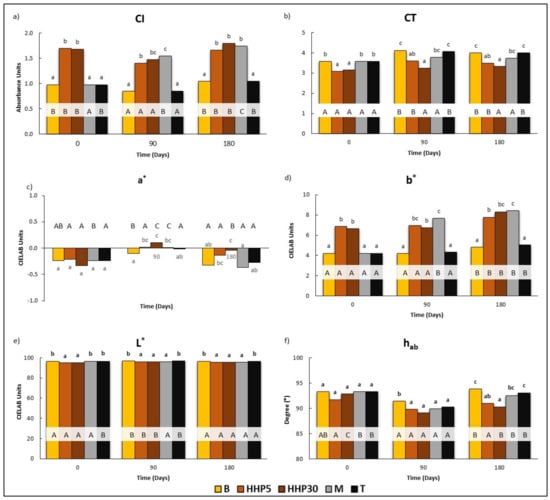 Effect of the application of HHP and maceration with holm oak chips on the evolution of chromatic characteristics in Cayetana wine: (a) Color intensity (CI), Absorbance Units; (b) Tint (CT); (c) Red−greenness (a*), CIELAB units; (d) Yellow−blueness (b*) CIELAB units; (e) Lightness (L*), CIELAB units; (f) Hue angle (hab), degree (°). B: Wines bottled without any treatment; HHP5, HHP30: Wines bottled after maceration of holm oak chips (5 g/L) with HHP treatments (400 MPa, 5 and 30 min). M and T: Wines bottled after storage for 45 days in tanks with and without maceration of holm oak chips (5 g/L). Different lower case letters indicate a significant difference (p < 0.05) among the treatments for the same day. Different capital letters indicate a significant difference (p < 0.05), for the same treatment on different days.
