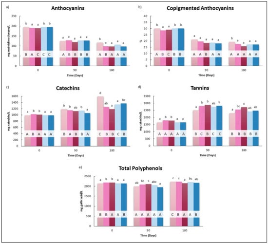 Effect of the application of HHP and maceration with holm oak chips on the evolution of polyphenolic composition in Tempranillo wine: (a) Anthocyanins, malvidine- 3-glycoside chloride, mg/L; (b) Copygmented anthocyanins (%); (c) catechin, mg catechin/L; (d) Tannins, mg catechin/L; (e) Total polyphenols content, mg gallic acid/L). B: Wines bottled without any treatment; HHP5, HHP30: Wines bottled after maceration of holm oak chips (5 g/L) with HHP treatments (400 MPa, 5 and 30 min). M and T: Wines bottled after storage for 45 days in tanks with and without maceration of holm oak chips (5 g/L). Different lower case letters indicate a significant difference (p < 0.05) among the treatments for the same day. Different capital letters indicate a significant difference (p < 0.05), for the same treatment on different days.