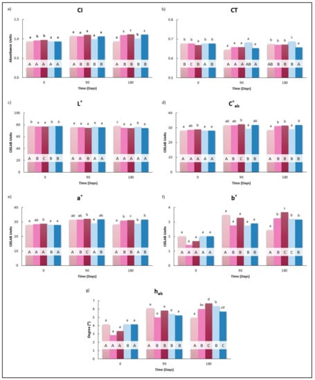 Therefore, considering that the anthocyanin content of the wines was only affected to a small extent by HHP at 0 days, only small variations in the values of CI (9.3 a.u.), CT (0.68 a.u.), L* (77.90 CIELAB units), a* (27.93 CIELAB units), b* (2.03 CIELAB units), C*ab (28.01 CIELAB units), and hab (4.15°) of the initial wine were found in wines pressurized as can be seen in Figure 5a–g. In fact, the ΔE* between HHP5 or HHP30 and B were 1.10 and 1.30 CIELAB units. Tao et al. (2016) reported slight increases (p < 0.05) in CI values of HHP oak treated wines (250 and 450 MPa for 45 min) with respect to control [].