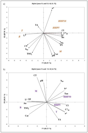 Principal component analysis of Cayetana (a) and Tempranillo (b) wine treated and untreated by HHP and holm chips. B: Wines bottled without any treatment; HHP5, HHP30: Wines bottled after maceration of holm oak chips (5 g/L) with HHP treatments (400 MPa, 5 and 30 min). M and T: Wines bottled after storage for 45 days in tanks with and without maceration of holm oak chips (5 g/L). TA: Total acidity; VA: Volatile acidity, TSO2: Total SO2, Hc: Hidroxycinamic compounds, Flv: Flavonoids compounds, TP: Total polyphenols; Cat: Catechins; An: Anthocyanins; Tan: Tannins; CI: Color intensity; CT: Tint; L*, a*, b: CIELAB Coordinates; C*ab Chromaticity; hab: Hue angle.