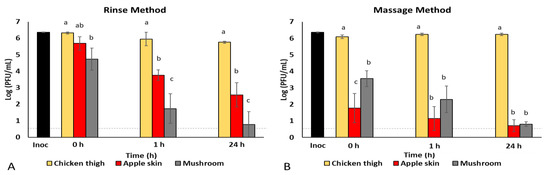 Rinse versus massage method comparison. Herpes simplex virus (HSV-1) was recovered from chicken thigh, apple skin, and mushrooms incubated at 4 °C for 0 h, 1 h, and 24 h using (A) rinse method and (B) massage method, quantifying infectious virus titer by standard plaque assay on Vero 76 cells and shown as log PFU/mL (n = 3). Inoculum (Inoc) titer is shown as PFU/sample (log); 10 µL of a 2.3 × 108 PFU/mL stock (≈2.5 × 106 PFU/sample) were inoculated onto each food sample. The dashed line indicates the detection limit (0.7 log or 5 plaques/mL) of the viral plaque assay. a–c Means within an incubation time that have a common lowercase letter are not significantly different (p < 0.05).