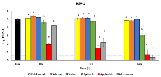 A recent study reported that a patient with a high SARS-CoV-2 load in respiratory fluid (2.35 × 109 copies/mL) may generate 1.23 × 105 copies of viruses from a single cough [25]. To assess infectious virus recovery from food surfaces using a relevant inoculum dose, we inoculated additional food samples with approximately 1 × 105 PFU/mL HSV-1. The virus was recovered using the rinse method immediately after inoculation (0 h) to quantify the maximum virus recoverable from each food type, and after 1 h and 24 h incubation at refrigeration temperature (4 °C). Table 2 shows HSV-1 infectious virus recovery from food samples over time (0 h, 1 h, and 24 h). Reductions in the recovered virus concentrations from chicken skin and salmon were not observed between 0 h and 1 h (p > 0.05), while virus concentrations were significantly reduced by 24 h post-inoculation (5.1 and 5.3 log PFU/mL at 0 h to 4.9 and 4.8 log PFU/mL at 24 h (p < 0.05), respectively). Similarly, recovery from spinach was significantly reduced by 24 h from 4.7 log PFU/mL at 0 h to 3.1 log PFU/mL at 24 h. Virus concentration recovered from mushroom was significantly reduced from 4.2 log PFU/mL at 0 h to 2.2 log PFU/mL at 1 h (p < 0.05), which was further reduced to 0.4 log PFU/mL at 24 h (p < 0.05). No reduction in virus concentration from shrimp or apple skin was observed up to 24 h incubation. Nonetheless, initial HSV-1 recovery from apple skin (0 h) was approximately 3 log PFU/mL lower than HSV-1 recovery from chicken skin, salmon, and shrimp. In addition, HSV-1 recovery was compared between the foods at the three different incubation times (Figure 2). At each time point (0 h, 1 h, and 24 h), approximately 5 log PFU/mL of HSV-1 was recovered from each of chicken skin, salmon, and shrimp. HSV-1 recovery from spinach was 0.5–0.7 log PFU/mL lower at 0 h and 1.9–4.7 log PFU/mL lower after 24 h than the HSV-1 recovery from chicken skin, salmon, and shrimp (p < 0.05). We also observed that HSV-1 concentrations recovered from mushroom and apple skin were significantly lower than those from chicken skin, salmon, shrimp, and spinach at 0 h, 1 h, and 24 h (p < 0.05).