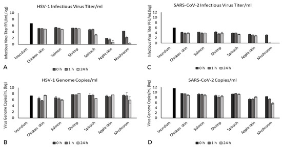 For HSV-1, the DNA copy number generally followed the overall distribution of infectious virus, with the DNA copy number being ≈1.5× higher than the infectious viral titer (5.7–8.1 log genome copies/mL vs. 3.1–5.3 log PFU/mL, Figure 4A,B) for all foods except for apples and mushrooms. The DNA copy number of HSV-1 recovered from apple skin did not increase over time as did the RNA copy number of SARS-CoV-2. It is noteworthy that, as observed for SARS-CoV-2, the DNA copy number of HSV-1 recovered from mushrooms was not related to infectious virus titer. Infectious virus titers recovered from mushrooms declined from 4.2 log PFU/mL at 0 h to 0.4 log PFU/mL by 24 h, although viral DNA continued to be detected up to 24 h (0 h: 7.5 log genome copies/mL, 24 h: 5.9 log genome copies/mL, Figure 4A,B). However, we detected a 75% lower infectious virus titer compared to viral genome copy at 0 h for HSV-1 compared to 54% lower for SARS-CoV-2 at the same time point (HSV-1: 7.3 log copies/mL vs. 1.9 log PFU/mL; SARS-CoV-2: 7.4 log copies/mL vs. 3.4 log PFU/mL, Figure 4). Similarly, we observed a 44% reduction in HSV-1 infectious virus titer at 0 h compared with genome copy number when applied to the mushroom, compared to a 63% reduction in infectious virus titer for SARS-CoV-2 compared to genome copy number at the same time point (HSV-1: 7.5 log copies/mL vs. 4.2 log PFU/mL; SARS-CoV-2:8.4 log copies/mL vs. 3.1 log PFU/mL, Figure 4). This may suggest food-specific effects on the viability of each virus, which may limit the usefulness of viral surrogates for specific food types. These results also confirm that nucleic acid detection methods such as qPCR/RT-PCR do not equate to infectious virus titer, but merely demonstrate presence of viral genetic material.
