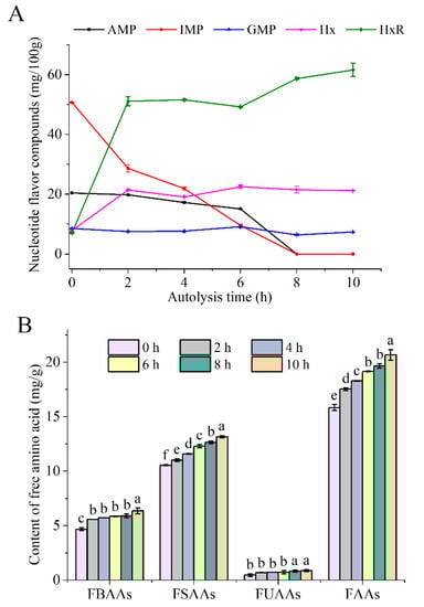 The change of different (A) FAAs and (B) nucleotide flavor compounds in SH during autolysis. The data marked by different letters means significantly different (p < 0.05) in each group. FBAAs, total free bitter amino acids; FSAAs, total sweet amino acids; FUAAs, total free umami acid; FAAs, total free amino acids. Umami amino acids including aspartic acid and glutamic acid. Sweet amino acids including threonine, serine, proline, glycine, methionine, alanine. Bitter amino acids including isoleucine, valine, leucine, tyrosine, methionine, phenylalanine, lysine, histidine, arginine.