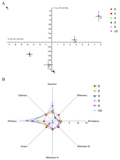 The response values of E-tongue are shown in Figure 3B. Sensor response output of 0 h was calculated as ‘”0” in this study. If the change in concentration of taste substance exceeds 1.0 scale, the human tongue can recognize the difference of sample [19,40]. With the increase in time of autolysis, the richness and sourness of SH increased, and the bitterness and umami taste decreased. No marked differences in saltness, astringency, aftertaste A, and aftertaste B were observed. Interestingly, there was inconsistency between the decrease of umami and bitterness and the increase of FBAAs and FUAAs in SH during autolysis (Figure 2). These data implied that the taste is a comprehensive sense by the synergistic work of different flavor components. The mechanism among amino acids, E-tongue, and taste should be studied in future work, which may usefully guide the development of food products. Additionally, according to the results of pH (Figure 5A), the production of acids may cause the enhance of sourness. Humans accept sour taste when mild but reject when strong [41]. The sourness increased mildly within 6 h, while increased sharply after 6 h, which may help to explain the result of sensory evaluation. Richness defines flavor intensity. The enhance of richness in SH suggested that the changes of taste are obvious and can be distinguished during autolysis. The reduction in bitterness may be due to the enhance in free sweet amino acids, which can mask bitter tastes. In summary, the changes of umami in SH may be caused by the combined work of sourness, richness, bitterness.