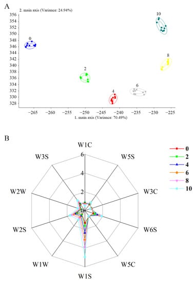 The experiment was according to the method from Zhu et al. [19] (PEN3, Germany). Briefly, a 15.00 g homogenized sample was placed into a 150 mL sterilized beaker and sealed the top. Then, the sample was equilibrated (10 min, 25 °C) to minimize sensor drift due to environmental changes [19]. The flush time, presampling time, and measurement time were 60 s, 5 s, and 70 s, respectively. Every sample was determined three times. Four replicates were completed for each group and then retained three stable sets of data. the statistically significant difference (p < 0.05) in the mean of each sensor was obtained by the least significant difference (LSD) test [19,20]. The detailed information of the 10 chemical sensors in E-nose is in Table S2.