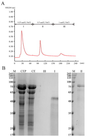 The autolysis of SH depends on different physicochemical conditions, including the temperature of incubation and pH. The influence of different temperatures and pH on enzyme activity of CEP was evaluated (Figure 6). The maximum activity under the assayed conditions took place at 50 °C and pH 7.5, respectively, which may be the optimal conditions to utilize autolysis. this result was similar to the results of Cao et al. [3] (50 °C and pH 7.85). The CEP was further separated and purified by DEAE–Sepharose fast flow column chromatography, providing three fractions (I, II, and III; Figure 7A). The outline and the results of the separation and purification of the endogenous protease are summarized in Table 5. The results indicate that I and II were the main endogenous protease of SH, especially II. SDS–PAGE analysis showed endogenous protease contained two major enzymes (~50 kDa and ~75 kDa, Figure 7B) which were most likely responsible for the changes of flavor during autolysis.