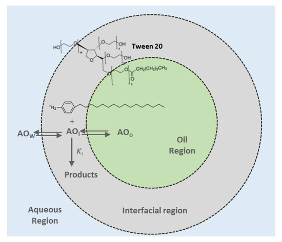 The phenolipids distribution was determined in the intact emulsions by employing a kinetic method that exploits the reaction between the compounds and the chemical probe 4-hexadecylbenzenediazonium (16-ArN2+) ion [22]. The probe is located at the emulsion’s interfacial region because 16-ArN2+ is at the same time an ionic surfactant and both oil and water insoluble (Figure 1).