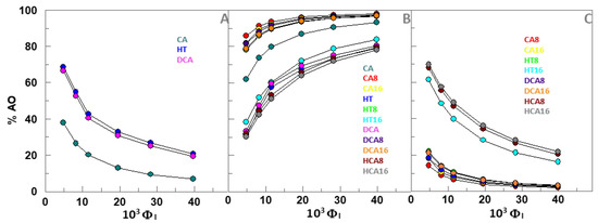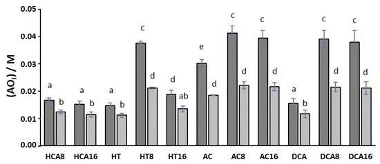 The antioxidant activity of AOs in intact emulsions was evaluated as in previous works by employing the Schaal oven test at T = 60 °C [5,6,10,11,12,46] and followed by the determination of the sample conjugated diene content (Figure S4, Supplementary data). We have shown in previous work [6,11,12,17,23] that the increase in the CD content is positively correlated (r2 > 0.970) with the increase in the peroxide value (PV) (AOCS Official Method Cd 8-53). The relative increase in the oxidative stability of emulsions in the presence of AOs can be observed in Figure 4. At ΦI = 0.005, the order of antioxidant efficiency (p < 0.05) was: DCA8 > CA8 = HT8 = DCA16 > CA16 > HT16 > HT = CA = DCA > HCA8 = TY8 = TY16 = HCA16 > TY = HCA = Control. At ΦI = 0.01, the order of antioxidant effectiveness was very similar to that obtained above for 0.5% emulsifier: DCA8 > CA8 > HT8 > DCA16 > CA16 > HT16 > HT = CA = DCA > TY8 = TY16 = HCA8 = HCA16 = TY = HCA = Control.