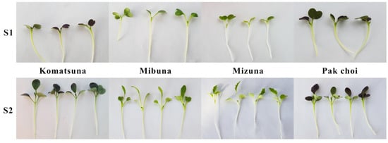 Phenological stages for harvesting four Brassica rapa L. genotypes (Komatsuna, Mibuna, Mizuna, Pak Choi grown under controlled conditions: S1-appearance of the first true leaf; S2-appearance of the second true leaf).