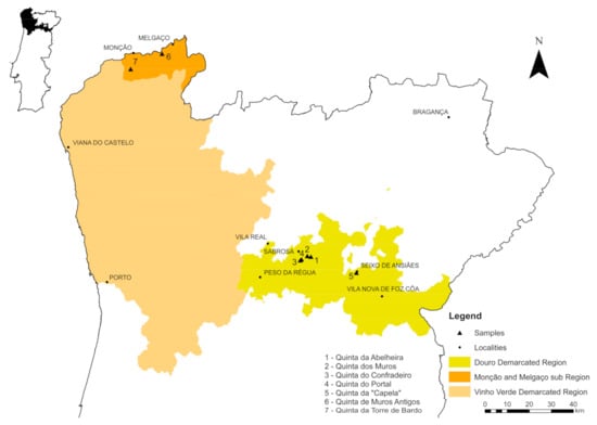 In this study, different samples of wine (11), soil (11) and bedrock (11) were collected from seven vineyards of the two demarcated wine-producing regions: (1) Monção and Melgaço sub region and (2) Douro region (Table 1 and Figure 1). The soil samples were collected from a depth layer of 10–20 cm, whereas the bedrock samples were collected in the same row of the corresponding grapevine samples. Bedrock and soil samples were crushed in a jaw crusher and grinded in an agate mill at the Department of Geology of University of Trás-os-Montes e Alto Douro. The sampled grapevine varieties were Alvarinho (white grapevine), Moscatel Galego (white grapevine), Touriga Franca (red grapevine) and Touriga Nacional (red grapevine) (Table 1).