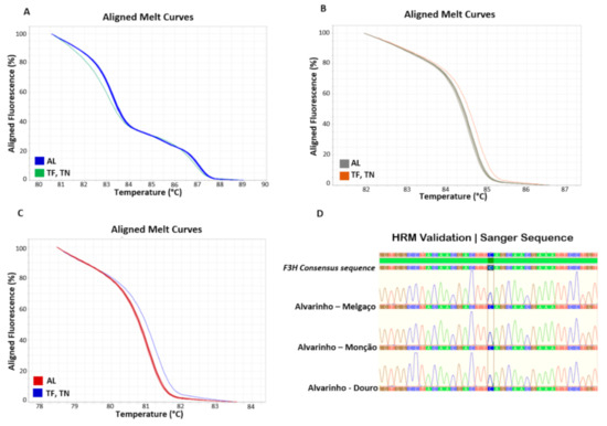 High-resolution DNA melting curve analysis for Alvarinho varieties, with different geographical provenance, analysed with three genes belonging to the anthocyanin pathway: (A) UDP glucose–flavonoid 3-O-glucosyl-transferase (UFGT); (B) Flavanone 3-hydroxylase (F3H) and (C) Leucoanthocyanidin dioxygenase (LDOX). The HRM profiles, based on varietal gene sequence, revealing only one haplotype/variant. Different Alvarinho clones were tested to validate the technique for varietal fingerprinting, and the results show an unique melting curve, accordingly to the nucleotide sequence (D). AL—Alvarinho, TF—Touriga Franca, TN—Touriga Nacional, HRM—High-resolution melting.