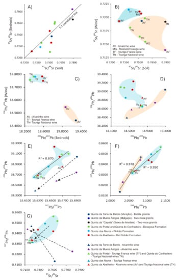 Sr and Pb isotopic ratios in wines, soils and rocks from vineyards located in Vinho Verde and Douro wine producing regions. (A) 87Sr/86Sr ratios in metasedimentary and granitic bedrocks and respective soils; (B) 87Sr/86Sr ratios in Alvarinho, Moscatel Galego, Touriga Franca and Touriga Nacional wines and respective soils; (C) 206Pb/204Pb ratios in Alvarinho, Touriga Franca and Touriga Nacional wines and respective bedrocks; (D) 208Pb/204Pb and 206Pb/204Pb ratios in Alvarinho, Touriga Franca and Touriga Nacional wines and respective bedrocks; (E) 208Pb/204Pb and 207Pb/204Pb ratios in Alvarinho, Touriga Franca and Touriga Nacional wines and respective bedrocks; (F) 207Pb/206Pb and 208Pb/206Pb ratios in Alvarinho, Touriga Franca and Touriga Nacional wines and respective bedrocks; (G) 207Pb/206Pb and 87Sr/86Sr ratios in Alvarinho, Touriga Franca and Touriga Nacional wines and respective bedrocks/soils.