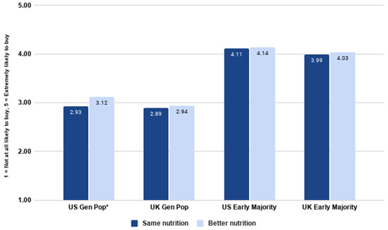- Does the likelihood of purchasing cultivated steak differ depending on whether the product is nutritionally the same, or nutritionally better?