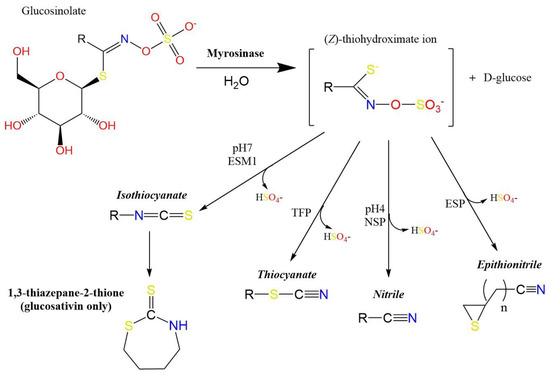 It is widely accepted that the distinctive aroma and flavour traits are produced by glucosinolate (GSL) hydrolysis products (GHPs [10]). GSLs are sulphur-containing secondary metabolites produced by Brassicales plants in response to biotic and abiotic stress [11]. Myrosinase enzymes are responsible for the hydrolysis of GSLs in water to form a plethora of GHPs, the conformation of which can be determined by the presence of enzyme cofactors, pH level, metallic ion concentration, and the precursor GSLs side-chain structure [8]. These products include: isothiocyanates (ITCs), nitriles, epithionitriles, indoles, oxazolidine-2-thiones, and other diverse products that result from tautomeric rearrangements (Figure 1).