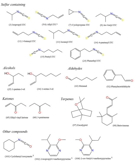 Chemical structures of volatile compounds found in horseradish, rocket, wasabi, and watercress samples (numbers in parentheses refer to compound codes in Table 2); * two separate peaks present for this compound; $ tentatively identified.
