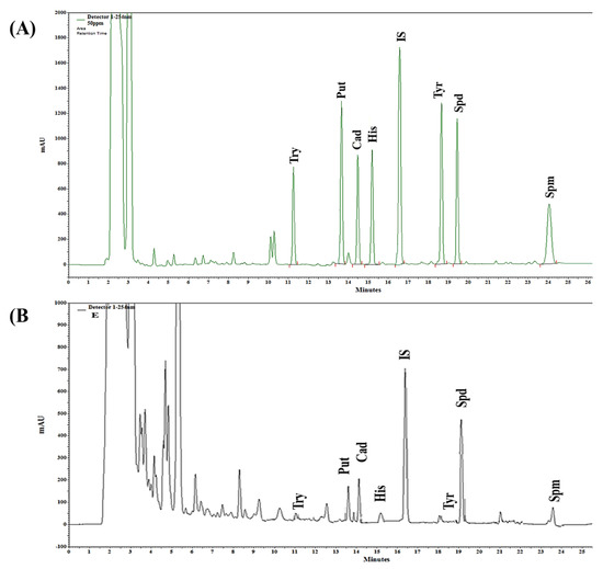 Representative HPLC chromatograms of all analyzed biogenic amines at λ = 254 nm. (A) Chromatogram of the standard mixture. (B) Representative chromatogram of one of the samples (ethanol extract). Try, tryptamine; Put, putrescine; Cad, cadaverine; His, histamine; IS (internal standard); Tyr, tyramine; Spd, spermidine; Spm, spermine.