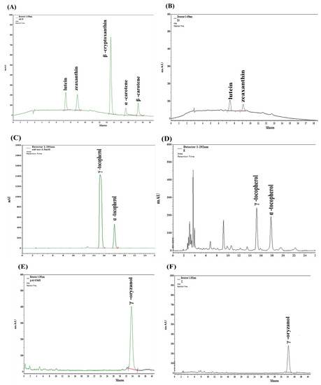 Representative HPLC chromatograms of bioactive compounds. (A) A standard mixture of all the analyzed carotenoids at λ = 450 nm. (C) A standard mixture of tocopherols at λ = 292 nm. (E) A standard mixture of γ-oryzanol at λ = 325 nm. (B,D,F) are representative chromatograms (ethanol extract) of carotenoids, tocopherols, and γ-oryzanol, respectively.