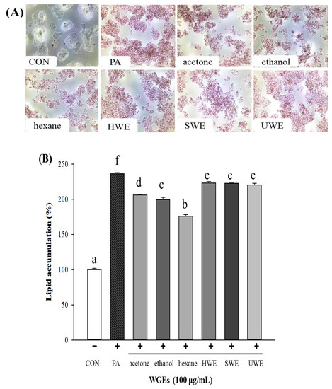 The in vitro studies were carried out using hepatocyte and adipocyte models in HepG2 and 3T3-L1 cell lines [9]. In this study, PA was used to induce hepatic steatosis, and cells were treated with WGEs for 24 h to evaluate lipid accumulation by ORO staining.