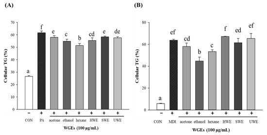 Effect of wheat germ extracts (WGEs) on cellular triglyceride (TG) accumulation. (A) The cellular TG accumulation in hepatocytes. (B) The cellular TG accumulation in differentiated adipocytes. TG concentration was normalized with protein content. Different letters indicate significant differences at p < 0.05 determined by Duncan’s multiple range test. CON, control; PA, palmitic acid; MDI (methylisobutylxanthine, dexamethasone, insulin; differentiated media); HWE, hot water extract; SWE, subcritical water extract; UWE, ultrasonic water extract.
