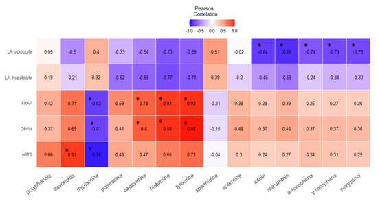 Heatmap showing Pearson’s correlation. Correlations between bioactive compounds and the antioxidant and antilipidemic activities of wheat germ extracts are shown. ABTS, DPPH, and FRAP show antioxidant activity, whereas the LA_hepatocyte and LA_adipocyte factors indicate an antilipidemic effect in those two cell types. The asterisk (*) shows significant differences (p < 0.05). LA_adipocyte, lipid accumulation in adipocytes; LA_hepatocyte, lipid accumulation in hepatocytes; FRAP, ferric reducing antioxidant power; DPPH, 2,2-diphenyl-1-picrylhydrazyl; ABTS, 2,2-azino-bis(3-ethylbenzothiazodine-6-sulfonic acid).