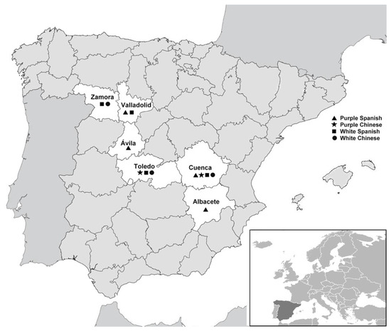 Map of Spain indicating the six provinces surveyed in this study (white area). The different symbols indicate the type of garlic analyzed in each province.