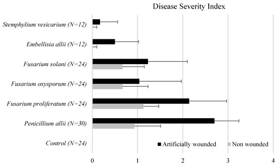P. allii isolates produced small, superficial lesions on non-wounded garlic cloves. In contrast, when wounded cloves were inoculated, green mycelial growth and internal progression of the lesion were observed. Inoculations with P. allii isolates reproduced the same symptoms as the original specimen. The DSI ranged from 2.17 to 3 (Figure 3). Four out of five isolates were considered highly virulent, and Embellisia allii and S. vesicarium were pathogenic to wounded garlic cloves. Superficial mycelial growth was observed on the wounded cloves, but no internal lesions were observed.