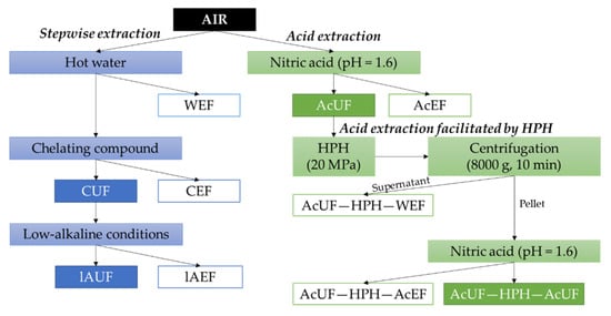 Schematic overview of the extraction methods starting from the alcohol-insoluble residue (AIR) and the obtained unextractable fractions (UFs) and extractable fractions (EFs). HPH = high-pressure homogenization; CUF = chelator UF; lAUF = low-alkaline UF; AcUF = acid UF; AcUF—HPH—AcUF = acid UF of the AcUF subjected to HPH; WEF = hot water EF; CEF = chelator EF; lAEF = low-alkaline EF; AcUF—HPH—WEF = water EF of the AcUF subjected to HPH; AcUF—HPH—AcEF = acid EF of the AcUF subjected to HPH.