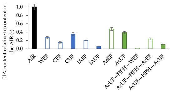 Uronic acid (UA) content relative to the content in the alcohol-insoluble residue (AIR) for the extractable fractions (EFs) and unextractable fractions (UFs). The error bars represent the standard deviation (n = 2.2).