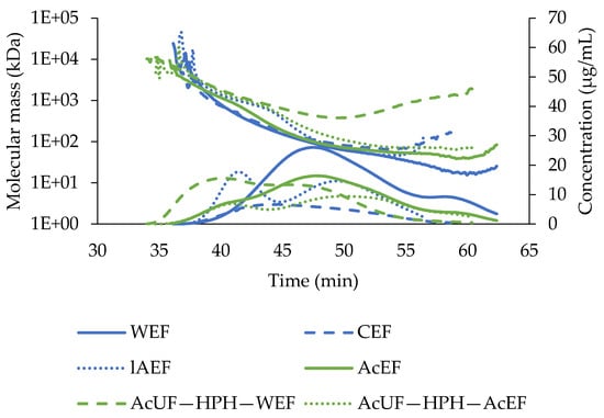 The MM distribution of the EFs was analyzed by size exclusion chromatography coupled with multiangle laser light scattering (PN3621, Postnova Analytics, Landsberg am Lech, Germany) and a refractive index detector (Shodex RI-101, Showa Denko K.K., Kawazaki, Japan) as described by Shpigelman et al. [54] with minor changes. Briefly, 100 µL filtered 0.2% (w/v) solution of each EF prepared as discussed above was injected by an autosampler (G1329A, Agilent Technologies, Diegem, Belgium). The sample was eluted with 0.1 M NaNO3 in a 0.1 M acetic acid buffer (pH 4.4) at a flow rate of 0.5 mL/min over three Waters columns in series (Waters, Milford, MA, USA), namely, Ultrahydrogel 250, 1000 and 2000, with exclusion limits 8 × 104, 4 × 106 and 1 × 107 Da, respectively, which were kept at 35 °C. Based on the dn/dc value of 0.146 mL/g, the concentration was obtained, whereas the MM was calculated using the Debye fitting method (up to the 2nd order) of the software (NovaMals, version 1.2.0.0, Postnova Analytics, Landsberg am Lech, Germany). For each sample, the analysis was performed in duplicate.