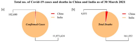 In the past two decades, the world has encountered various virus-related epidemics, for instance severe acute respiratory syndrome coronavirus (SARS-CoV) 2002–03, H1N1 influenza (2009), Middle East respiratory syndrome coronavirus (MERS-CoV) 2012, Zika 2016 and severe acute respiratory syndrome coronavirus-2 (SARS-CoV-2) 2019–20 [1,2]. In late December 2019, a new pneumonia outbreak originated in the largest metropolitan area of Wuhan in the Hubei province of China [3]. The Chinese Center for Disease Control and Prevention (CDC) concluded that the first unexplained case of new pneumonia emerged on 12 December 2019 as non-SARS nCoV. However, on 11 February 2020, the World Health Organization (WHO) announced a new name for the epidemic disease caused by 2019-nCoV, coronavirus disease (COVID-19), and the International Committee on Taxonomy of Viruses (ICTV) renamed the formerly termed 2019-nCoV as severe acute respiratory syndrome coronavirus-2 (SARS-CoV-2) [4]. At present (30 March 2021), there are 126,359,540 COVID-19 confirmed cases reported in the world with total 2,769,473 deaths and 102,765,148 recovered. In China, there are 102,680 confirmed cases with total 4851 deaths and they are presently facing a second wave of COVID-19; however it remains under control with proper implementation of testing and individualized health QR codes used to gauge the path of the virus and contain the outbreak [5]. Contrarily, India has been severely affected by COVID-19 with 11,971,624 confirmed cases and 161,552 deaths (WHO Coronavirus Disease (COVID-19) dashboard) (Figure 1a,b). Currently, India is going through a crisis mainly due to the ongoing second wave of COVID-19, which has resulted in a significant increase in the infected number of cases and deaths compared to the previous wave. Lockdowns and restrictions have been imposed once again. Nevertheless, there is a large proportion of recovered patients from COVID-19 at the same time.