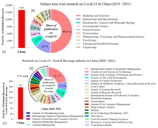 (a) Total number of published research studies on COVID-19; (b) subject area specific research on COVID-19 in China (2019–2021); (c) total no. of research studies and (d) research publications on COVID-19/food and beverage sector in China (2020–2021).