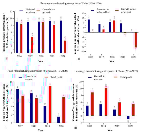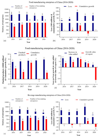 China’s food manufacturing enterprises’ cumulative growth dropped to −23% in 2019, then rebounded to 3% in 2020 (Figure 4b). In 2019, the food manufacturing loss was reduced from China Yuan (CNY)145 billion to CNY 111 billion, but due to the COVID-19 impact, the loss increased to CNY 116 billion in 2020 (Figure 4b). On the contrary, the beverage industry’s cumulative growth was consistently in a loss, estimated at −3.5% in 2016, −13.7% in 2017, and −5.7% in 2018. However, there was a remarkable gain in the cumulative growth in 2019 at 30.8% which severely dropped by −30.5% in the year 2020; this could be due to the COVID-19 impact (Figure 4f).