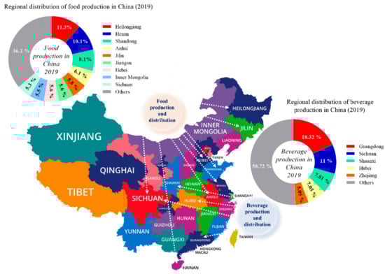 The major beverage production industries and their distributions are from the Guangdong province, ranking topmost by contributing 18.32% of the total share of beverage production in China, followed by Sichuan 11%, Shaanxi 7.81%, Hubei 7.05%, Zhejiang 5.05%, and others 50.72% in 2019, respectively (Figure 5).